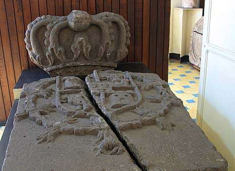 Escudo de España trabajado en roca. Siglo XVIII. Perteneció a la portada de la Real y Pontificia Universidad de San Carlos en la Ciudad de Santiago de Guatemala. Fue trasladado a la Nueva Guatemala de la Asunción y se colocó en la portada de la Universidad de San Carlos.